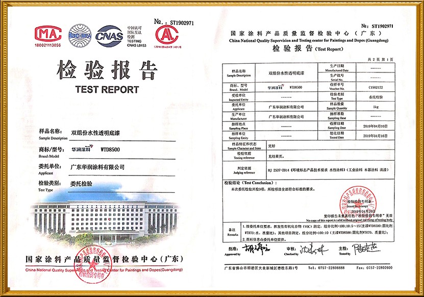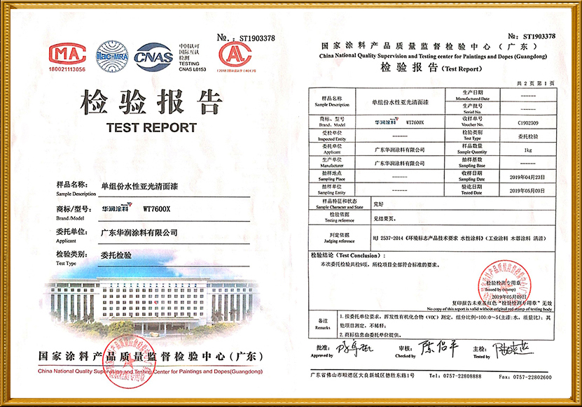 (水性漆)通過國家涂料產品質量監督檢驗中心檢測。
